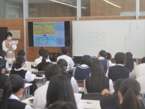 本日、市の地域包括支援センターの方に来校していただき、認知症の方への声かけや手助けができるサポーターを養成することを目的とした、「認知症みまも-り-♡隊員」養成講座(「認知症サポーター養成講座」の上級編)を、2年生を対象に開催していただきました。