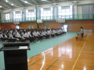 今回は、これからの進路決定に向けて、進路指導担当からの今後の流れの説明があり、続いて、県立高等学校、京都の私立高等学校、滋賀の私立高等学校のそれぞれの学校の担当者からお話を聞きました。